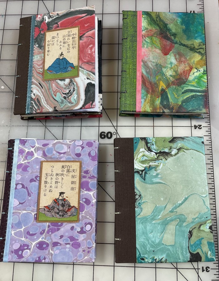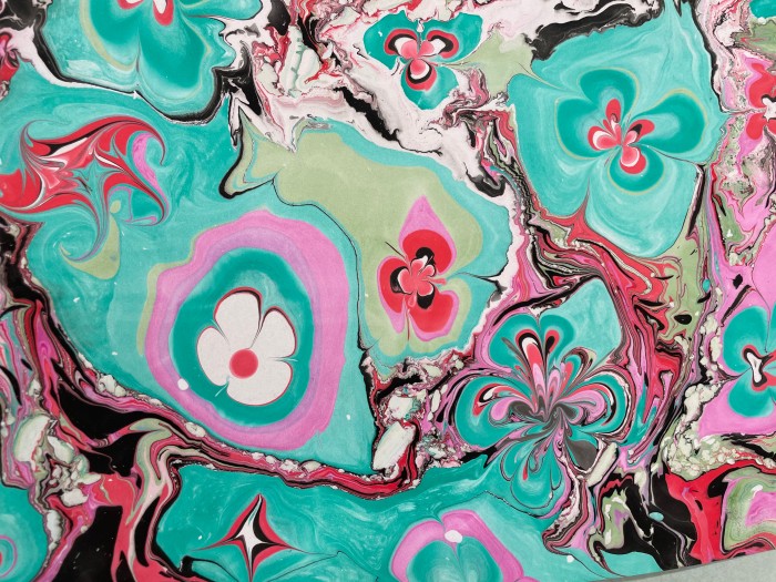 There are 30 meanings listed in the Oxford English Dictionary for the word “flow”. In this workshop we will explore the word flow in as many forms as possible. By floating acrylic paints onto a thickened medium; Kathy will guide us in creating a collection of exquisite marbled papers with each paper offering it’s own unique style, whimsy and expression.
